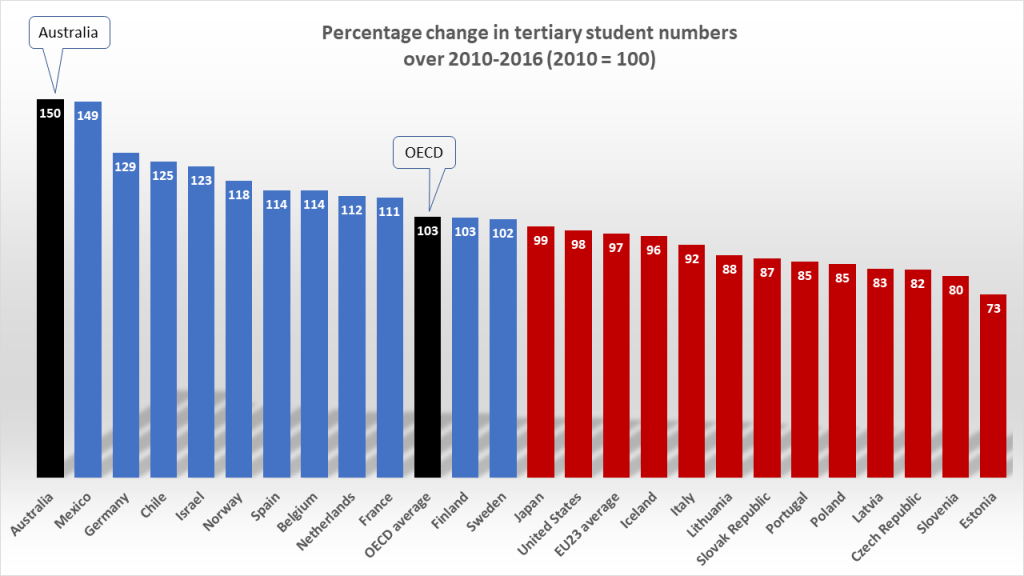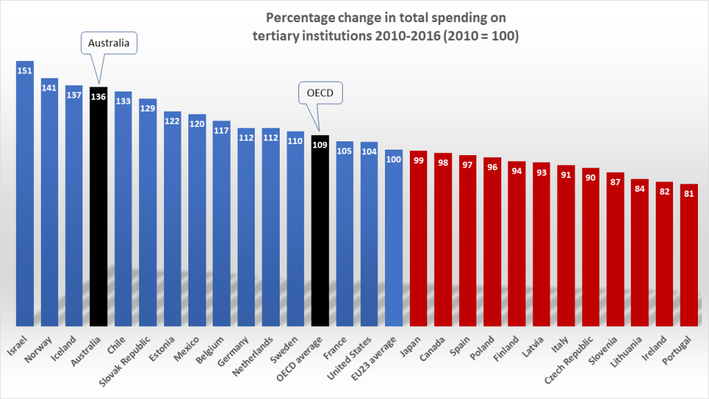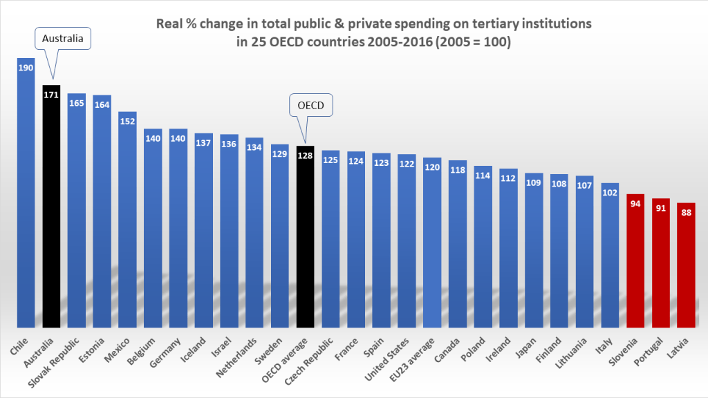 For many years, Australia has fared better than most. Since 2012, every report has shown our tertiary sector revenue growth outpacing the OECD average. In the 2019 report figures, total spending grew by 71% over 2005-2016. OECD average growth was 28%.