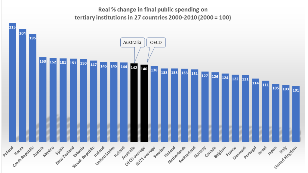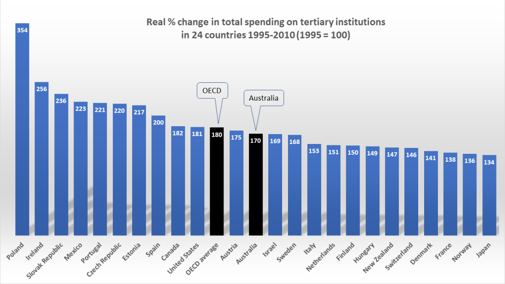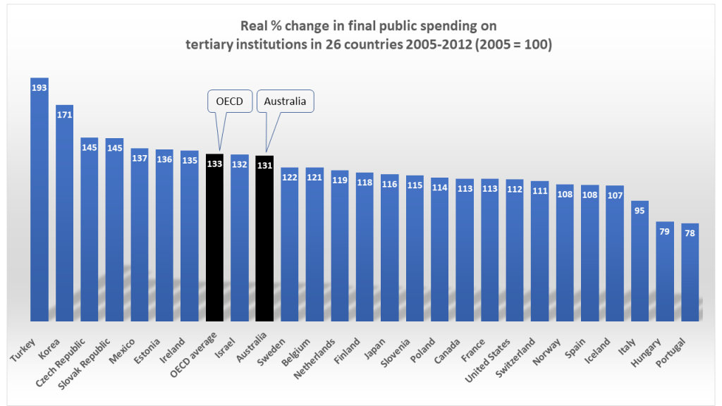 Overall, most OECD evidence doesn’t fit the Australian folklore. In that narrative all we ever seem to see is a sector “ranked near the bottom for public investment”. Some say even total spending in Australia peaked circa 1995, then remained static despite rising participation. In 2013 one Melbourne Centre for the Study of Higher Education expert put it this way: