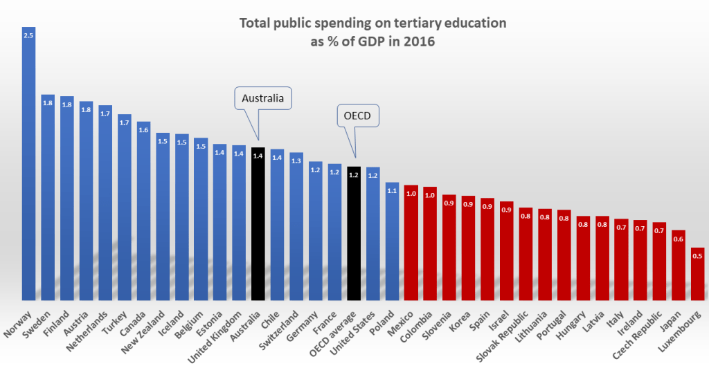 Australia rates among the bottom four countries at 0.7 percent of GDP in its public investment in tertiary education, or about 40 percent less than the OECD average of 1.1 percent. Public investment in tertiary education as a proportion of GDP is far more in … Portugal.