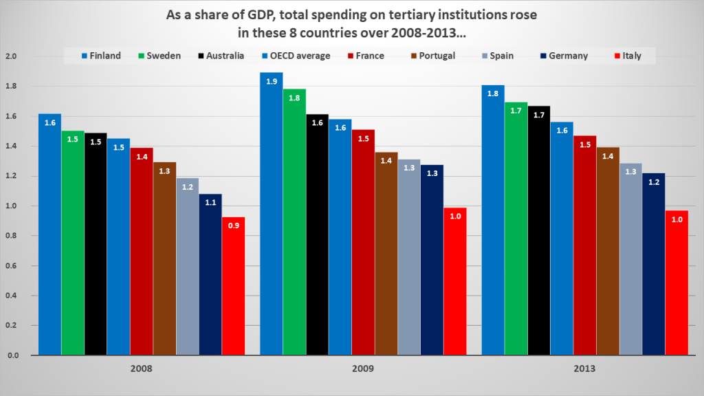 “in 2010 Australia spent 1.6 per cent of its GDP on tertiary education…In 1995, Australia likewise spent 1.6 per cent…The OECD average was then 1.2 per cent. It has now risen to 1.7 per cent. The world is increasing participation and increasing spending. We are just increasing participation…”