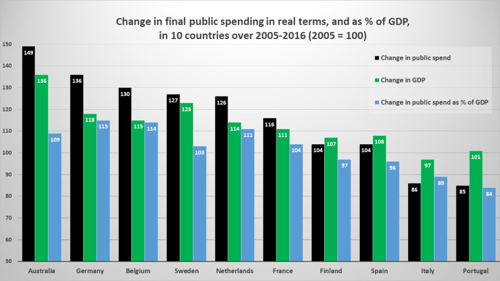 This view echoes other 2017 commentaries. But as Charts 1 and 2 show, by 2016 Portugal had seen years of spending decline: a 15% fall in final public spending, as Australia’s rose 49%. Clearly, shares of GDP don’t reliably compare levels of spending in cases like these. As Chart 5 shows, over 2001-2016 Australian GDP grew by 53%, while in Portugal it grew by 2%. The OECD average growth was 30%, and the EU average 21%.