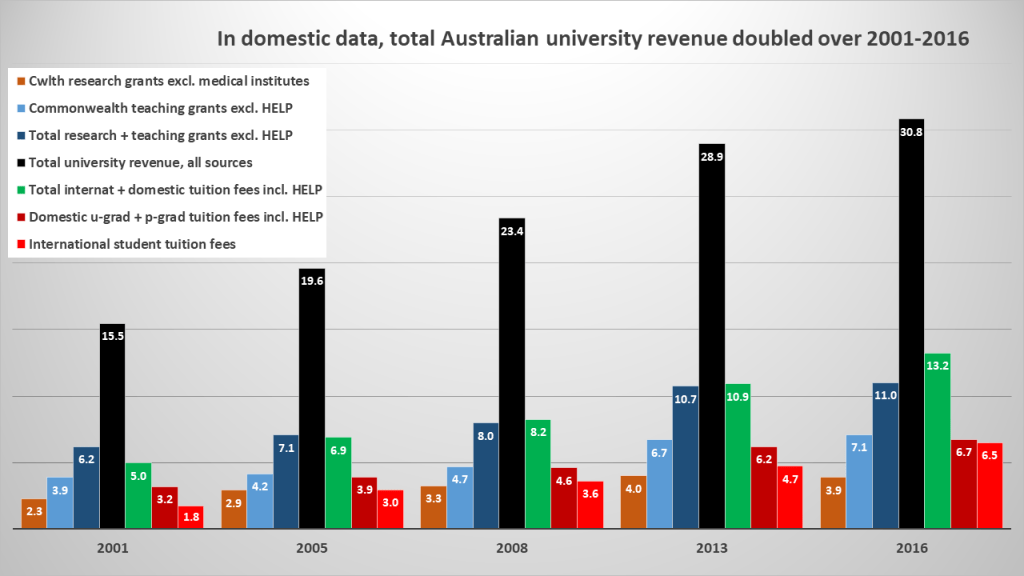 For the Australian university sector, domestic figures also show a strong growth trend. Over 2005-2016 teaching grants grew by 71%, from $AU4.2 to $7.1 billion. Research grants grew more modestly, by 33%. Combined, grants for teaching and research grew by 55%.
