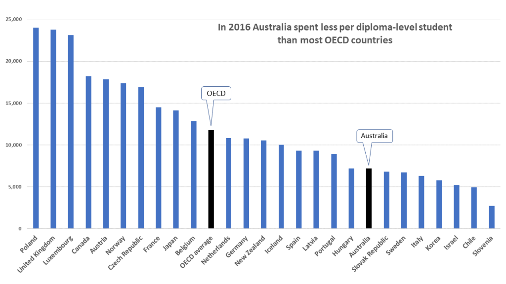 That said, a third caveat on the second is that in 2016, the Australian system looked much weaker in spending per student at the sub-degree level, where vocational diplomas loom large. Here most other countries (including Germany, New Zealand and Portugal) look stronger. This is consistent with concerns in recent years that the Australian VET sector needs system redesign and funding model repair.