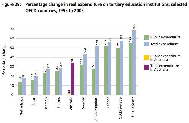While total spending as a share of GDP was relatively high in 2005 (but lower than in cases such as Sweden and Korea, the Review noted), our decline in the public share of spending is seen as a problem. Simon Marginson has called this a “long free fall” from the end of the 1980s. In his report to the Bradley Review he noted that the OECD average level of public spending grew by 49% over 1995-2004, while in Australia it shrank by 4%. (To highlight this, the Review included just one graph to highlight real spending trends – in an “Anglo-Nordic plus Japan” sample of OECD countries over 1995-2005.)
