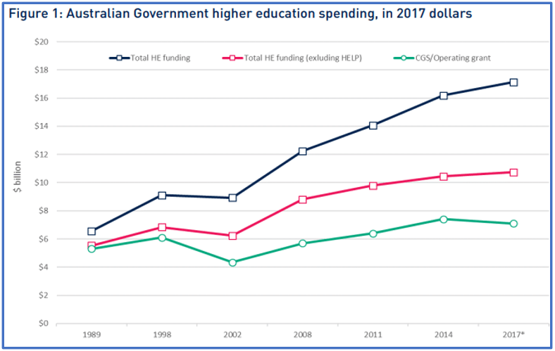 Implicitly at least, the fact that Australian universities have seen good growth in total public spending (outlays) is writ large in Universities Australia’s July 2019 Facts and Figures report (chart below).