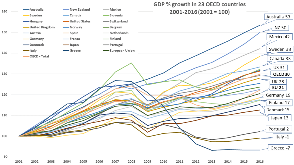 As a share of GDP our rate of public spending was below the OECD average rate. It had been for years, but there were reasons for this. And after the crisis, high GDP growth masked our spending growth while low GDP growth masked lack of spending growth in other places. So why did we make so much of being second-lowest in the OECD? If Australia spent 0.7% of our GDP while Italy or Greece or Portugal spent 0.8-0.9% of theirs, so what?