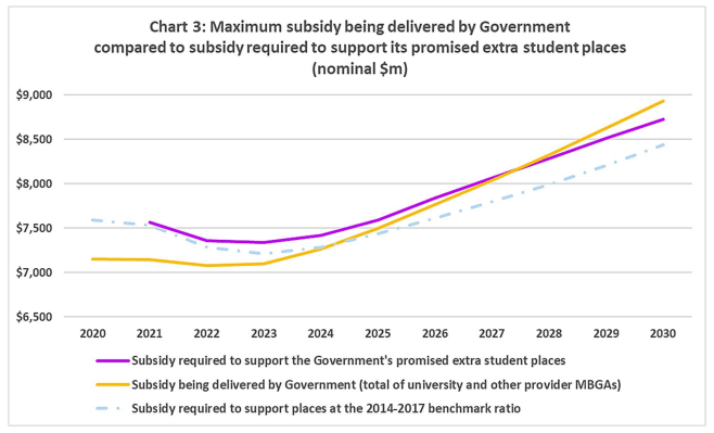 A second objection is that the benchmark is a funding-driven view of course capacity and enrolment volumes. So by 2020, on this view, the 2018 funding freeze had led to nearly 37,000 fewer subsidised CSPs. This implies (as the paper’s point on restoring opportunity makes clear) that lack of funding left significant student demand unmet.