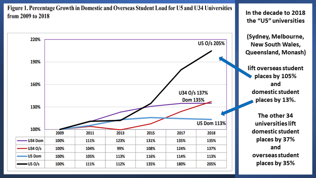 The revenue incentive to recruit international students instead of domestic ones can be seen in the growth strategies of the five largest Group of Eight universities. As MCSHE’s Frank Larkins showed in a paper last year (Exhibit 9): The U5 group of universities – Sydney, Melbourne, New South Wales, Queensland and Monash – in their quest for revenue growth have all profoundly changed the balance of their student profiles between domestic to overseas students over the decade 2009 to 2018.