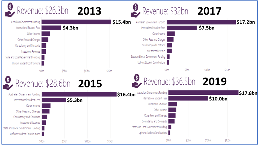 In Education Department figures it is true that the growth of total Commonwealth funding (including HELP) slowed down over 2013-2019. It rose by $1bn over 2014-2015, then by $0.8bn over 2016-2017, then by $0.6bn over 2018-2019. But at the same time, total sector revenue rose ever more strongly due to rising international enrolments. It rose by $2.3bn over 2014-2015, then by $3.4bn over 2016-2017, then by $4.5bn over 2018-2019. The international student fee component rose by $1bn over 2014-2015, then by $2.2bn over 2016-2017, then by $2.5bn over 2018-2019.