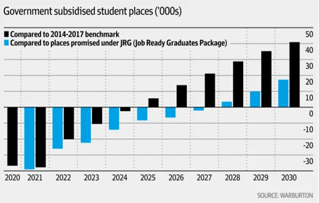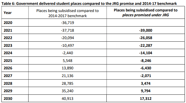 The “vibe” here is clear. Since 2018, government decisions have left courses under-funded and so left thousands of prospective students out of the system. And while thousands of extra places were promised this year, the government hasn’t delivered them. As an MCSHE post on LinkedIn puts it: one year on from the Government changes … The rhetoric of JRG has proven to be hollow, with research indicating there has not been the touted increase in student places … If the Government was to honour the claims it made to the public and the Parliament, it would need to provide around $1.1 billion more in subsidy from 2021 to 2024.