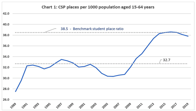 However the paper’s use of this “benchmark” to estimate funding and enrolment shortfalls is questionable. It assumes that the peak rate of CSP student enrolment seen in 2017 under demand-driven funding should have been a government funding target ever since: From 2014 to 2017, the number of subsidised student places grew … from 597,000 to 623,000. The system was relatively stable in size compared to the working age population. As highlighted in Chart 1, it was providing around 38.5 student places for every 1,000 people of working age during this four-year period. This will be referred to as the 2014-2017 benchmark ratio throughout this paper…