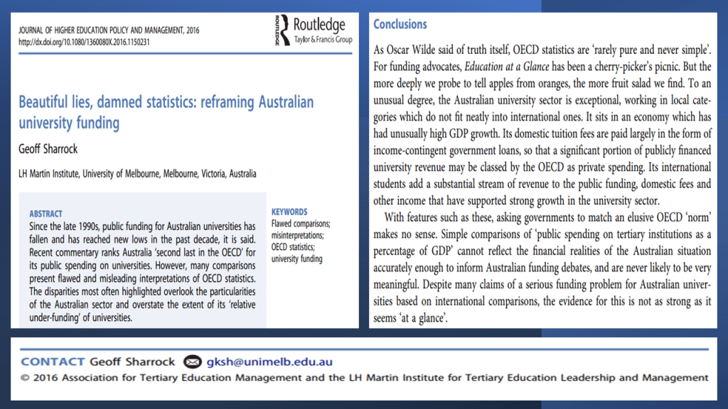 Further, you say now that the journal does not offer enough scope for “open debate” of my analysis. But we all know that a right of reply in the journal itself is standard procedure and that this was suggested to the complainant initially (by me) back in March … To reiterate the obvious, it is hard to avoid the conclusion that the complainant has succeeded in vetoing my paper without having to justify any of his accusations in an open manner. The veto appears to have succeeded not because, in some unspecified way, my paper misrepresented his own or anyone else’s commentary; but because its critique of flaws in the OECD statistics narrative is unanswerable. The paper is not all about the complainant. But my impression is that no one responsible for the journal has been willing to tell the complainant that, along with many others, some of his commentary on OECD data has flaws … This year’s new OECD report presents a new dataset, with figures again providing a perfect platform to reprise last year’s “second last in the OECD” narrative. But this trope has not reappeared in media commentary. It is “the dogma that did not bark”: a tacit recognition that however unwelcome the implications may be, my analysis is correct, and as a sector we should stop using these “one-dimensional” funding comparisons. One reason why peer reviewers such as Vin Massaro supported publication initially is that they recognised that the analysis makes a contribution to the way OECD data should be understood in Australian commentary. This is just what scholarly journals are for.
