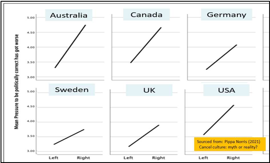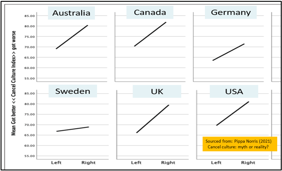 Norris observes that in predominately liberal social cultures such as the US, self-identified right-wing scholars were most likely to perceive that they faced an increasingly chilly climate (while in more traditional cultures such as Nigeria, it is liberal scholars who report that a cancel culture had worsened in colleges and universities). As shown in the selection at Chart 2, she notes further that the US pattern, where those on the right report worse experiences of the cancel culture, is reflected in the cases of Canada, Australia and the UK, among others.
