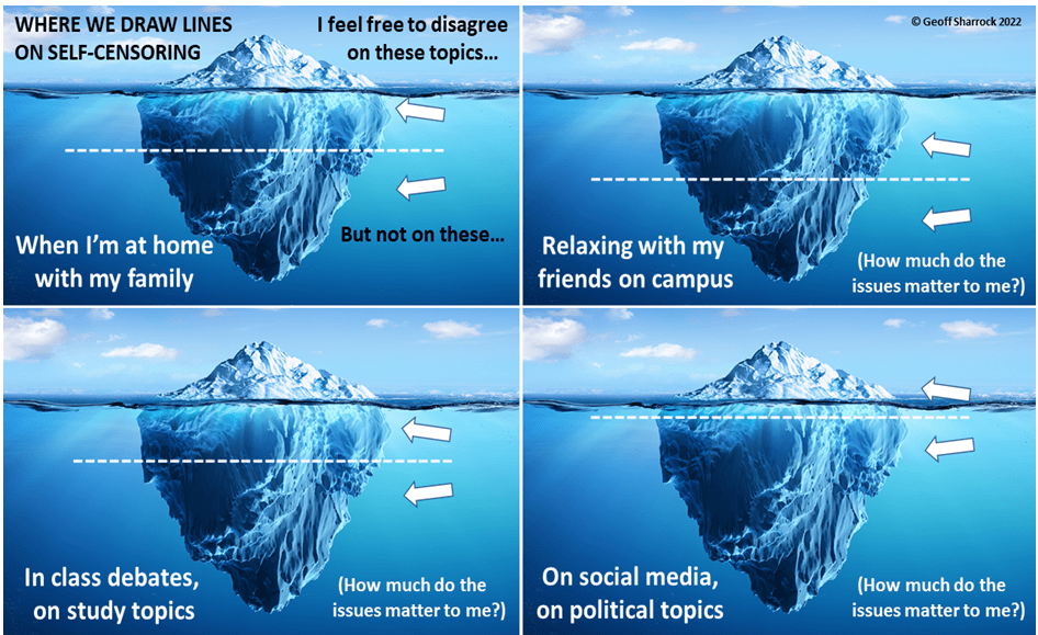 These context discussions expand on a theme built into this current viewpoint diversity visibility project from the outset. The premises are that (as the English poet John Donne put it in 1624) “no man is an island”; but also that, on the question of expressive conduct in different group settings, everyone’s an iceberg.