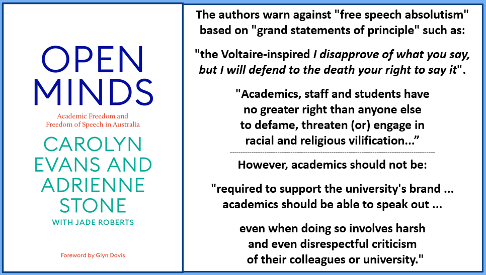 In their 2021 book Open Minds, legal scholars Carolyn Evans and Adrienne Stone consider a Canadian statement on freedom of speech from the University of Toronto. It promotes free exchange as mission-critical; but adds that the purpose of the university also depends upon an environment of tolerance and mutual respect … free from discrimination and harassment. Evans and Stone concur, arguing that freedom of speech is highly valued, but if members of the university are not treated as equals and cannot enjoy an environment in which they are able to participate fully, freedom of speech rings hollow…