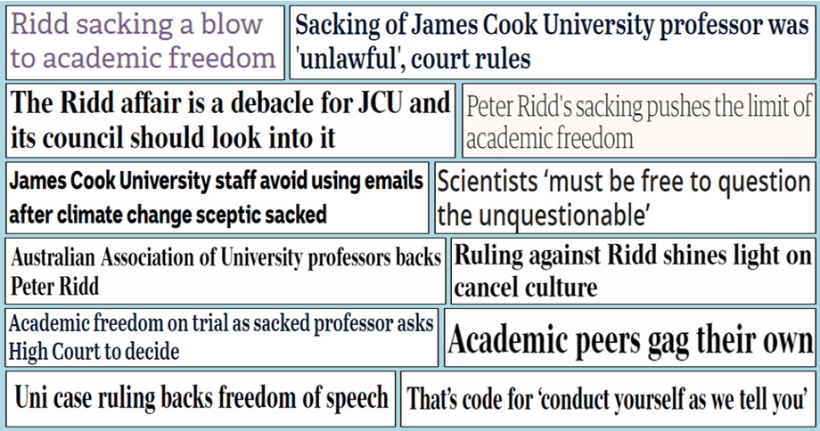 News of the email search led many other JCU staff to stop using their office email accounts. For the wider public the Ridd case held a rare public mirror up to a process of intramural managerial cancel culture. In other circumstances this may well have remained invisible, under the university’s confidentiality rules. As it went through 3 courts over a period of more than 2 years, the dispute drew a lot of bad press, from across the political and media spectrum (see Chart 4). It illustrated how disproportionate cancel culture tactics may shred the norms of academic work – whatever sector leaders say about institutional commitments.