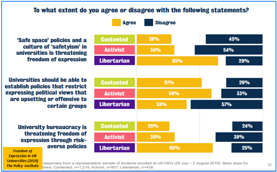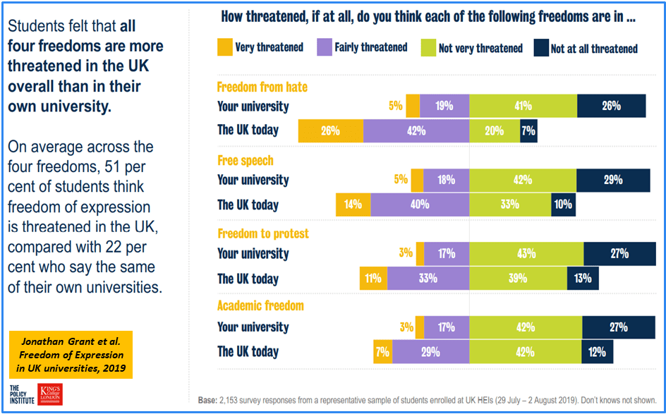 The Policy Institute’s outline of its report findings concludes that: 65% of students now say free speech and robust debate are well protected at their institution. But also that: 34% of students say free speech is very or fairly threatened in their university – up from 23% in 2019. Similarly, 32% of students now feel academic freedom is threatened at their institution, compared with 20% who felt this way three years ago. Despite these increases, a majority of students still feel these liberties are not at risk – for example, 59% still think free speech is either not very threatened or not threatened at all.
