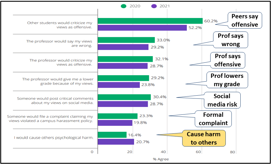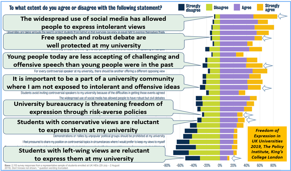 As noted, social media participation permeates everything and often dissolves the campus learning context around any particular exchange of views. For students (and scholars) the fact that on-campus and off-campus contexts often overlap means that the perceived risks in one domain may shape their sense of risk in the other. In the US a FIRE survey of 20,000 students in 2020 (reported here) found that students were least comfortable with the prospect of expressing an unpopular view on social media (see Chart 10). The issue is to what extent the impulse to self-censor in that arena will translate into greater viewpoint conformity on campus (whatever their private view might be).