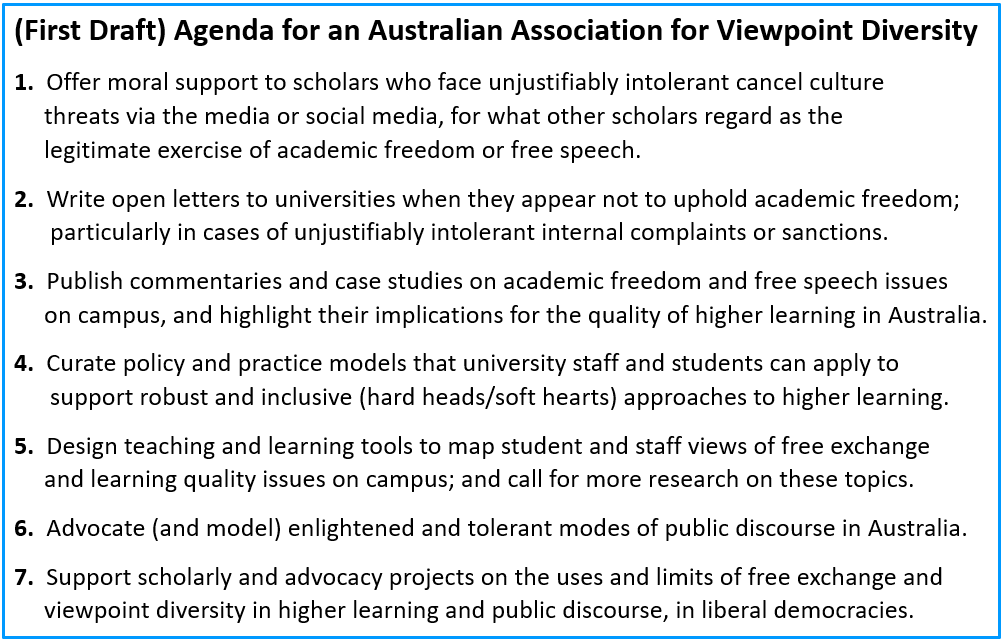 At the outset, a premise of this project was that it would lead to a new Association devoted to further work on these issues. This would be philosophically aligned with Heterodox Academy and share its main aim: to improve the quality of research and education in universities by increasing open inquiry, viewpoint diversity, and constructive disagreement. However, as outlined at the May webinar (by Andrew Glover at RMIT University, who initiated this project with the Association idea in mind) the new body would operate quite separately, to focus on the Australian higher education context and take public positions on Australian cases as they arose.