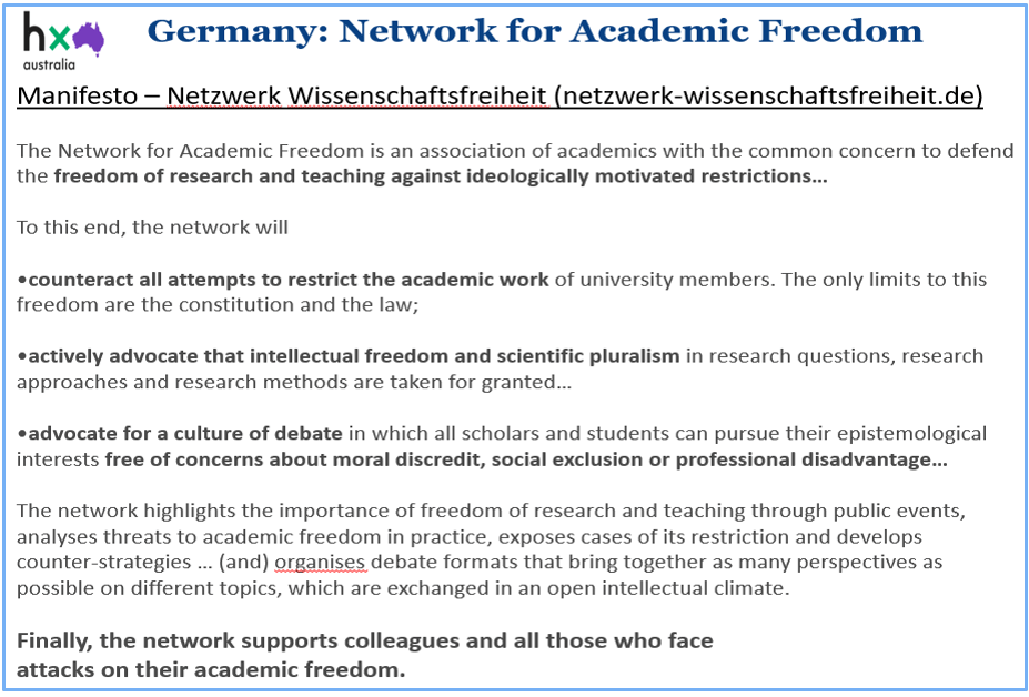 How best to constitute, resource and operate a non-partisan Association for Viewpoint Diversity (working title) should be the subject of separate papers and further webinar discussions. If there is significant support, one issue for its proponents to consider will be whether, from the outset, it may be branded as a right-wing organisation on the basis of name alone. (Despite the currency of the term viewpoint diversity as part of Heterodox Academy’s own mission statement, views diverge about what this term means). To illustrate this Association design issue, at the June webinar I presented as one overseas example how the UK’s Free Speech Union had lost support on campus (Chart 19). By way of contrast, I presented a new network in Germany that focused very specifically on the preconditions for exercising academic freedom in scholarly work (Chart 20).