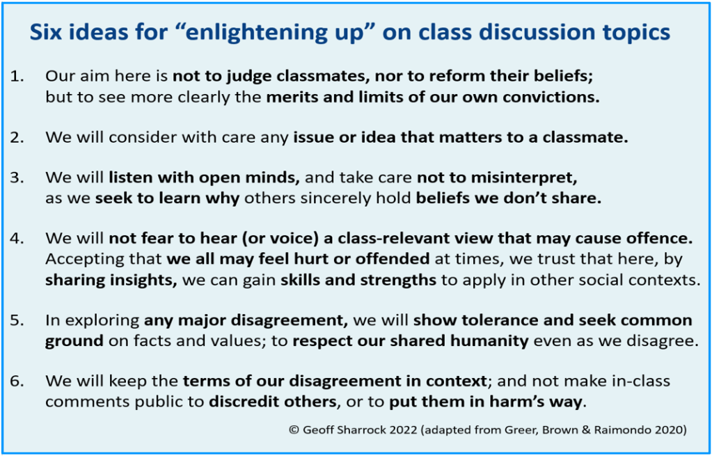 At Chart 11 (now updated more than once in light of reader comments) I’ve drawn on these ideas to formulate an “enlightening up” framework for (serious) class or syndicate group discussions. This is line with the two main premises of this project: John Stuart Mill’s 1859 insight that often, conflicting doctrines share the truth between them; and Bertrand Russell’s 1959 message that, in an ever more closely connected world, charity and tolerance are vital. The framework calls for careful consideration of others’ concerns, tolerance when there is major disagreement, and resilience to contend with issues or viewpoints that cause offence, on and off campus. Recalling the social media risks outlined earlier, tolerance here includes refraining from sharing a comment out of context to discredit an opponent’s standpoint; or worse, disclosing something private that might put a vulnerable person at risk of harm in some off-campus context.