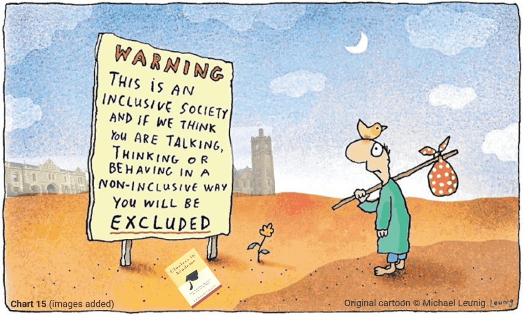 In sum, a radically inclusive university would find ways to promote what US scholar bell hooks called “radical openness“. And in promoting the disciplined practice of tolerance as a paramount value in a multi-cultural, multi-faith society, scholars and administrators would take care not to enact the tolerance paradox Karl Popper outlined in The Open Society and its Enemies in 1945: If we extend unlimited tolerance even to those who are intolerant, if we are not prepared to defend a tolerant society against the onslaught of the intolerant, then the tolerant will be destroyed, and tolerance with them. To illustrate this point, the whimsical Australian cartoon at Chart 15 represents the risk campus newcomers may feel, and their sense that they may be misconstrued and expelled not for expressing hatred or discrimination or intolerance toward others, but for being (as US scholar Gerald Graff put it two decades ago) clueless in academe.