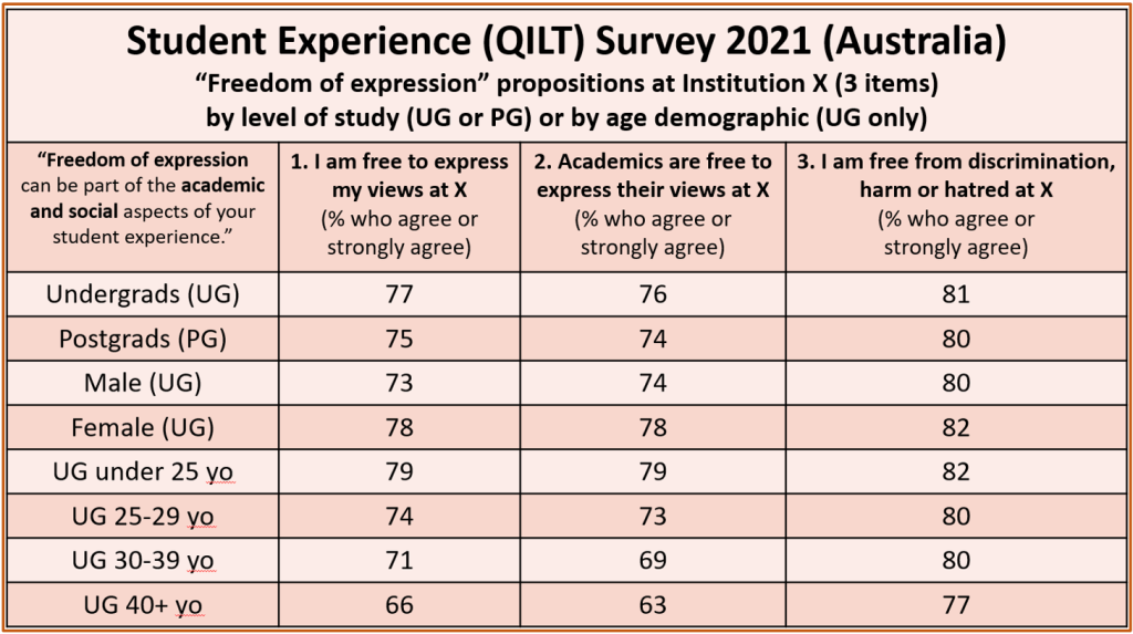 Australia lacks good data on questions such as the extent to which students or staff self-censor on campus, due to fear of some form of sanction. At the time of the French Review‘s report the Institute for Public Affairs presented some apparently concerning results from its own student survey, in which 41% of 500 respondents agreed that: I sometimes feel unable to express my opinion at university. During this project the latest QILT survey of student experience was not yet available. Conducted in 2021, it includes 3 items: I am free to express my view at (institution); Academics are free to express their views at (institution); I am free from discrimination, harm or hatred at (institution). (See Notes for updates on this.)