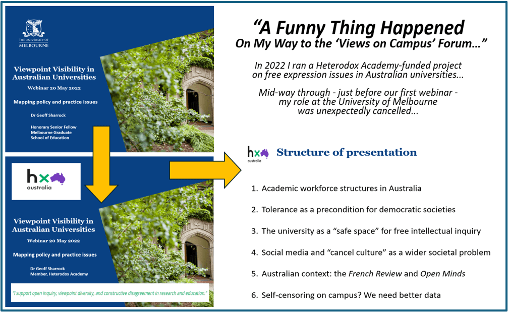But in the days leading up to that first webinar, an email from the Director of the Centre for the Study of Higher Education, Professor Sophie Arkoudis, informed me that (on her advice) MGSE had decided not to renew my (unpaid) role with MGSE after all. Her brief note (by email) offered no explanation for the reversal. Nor did it invite any discussion.