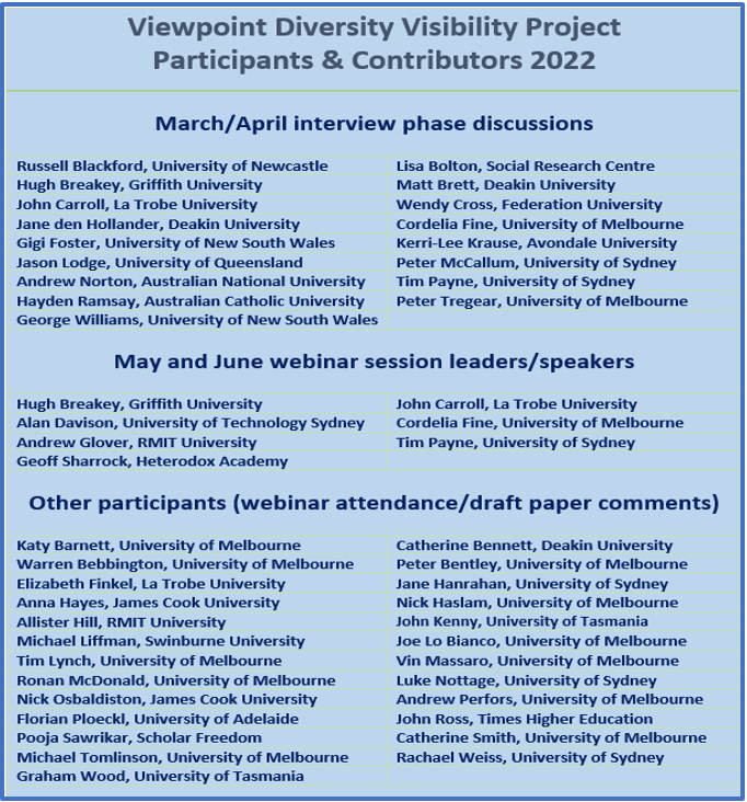 The paper would aim to map and make sense of viewpoint diversity issues in Australian higher learning contexts where controversial topics seem less open to scholarly debate than they could be. And suggest ways to promote greater viewpoint visibility on our campuses. The principle here is that intellectual pluralism should be accepted (and protected) as an inescapable feature of the practice of rigorous and open-minded scholarly inquiry in universities.