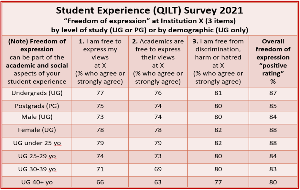 In Australia, our latest (2021) Student Experience Survey indicated that 3 in 4 undergraduates felt free to express their views and 4 in 5 felt free from discrimination, harm and hatred. And (as for undergraduates) 1 in 4 postgraduate students were not confident that they were free to express their views.