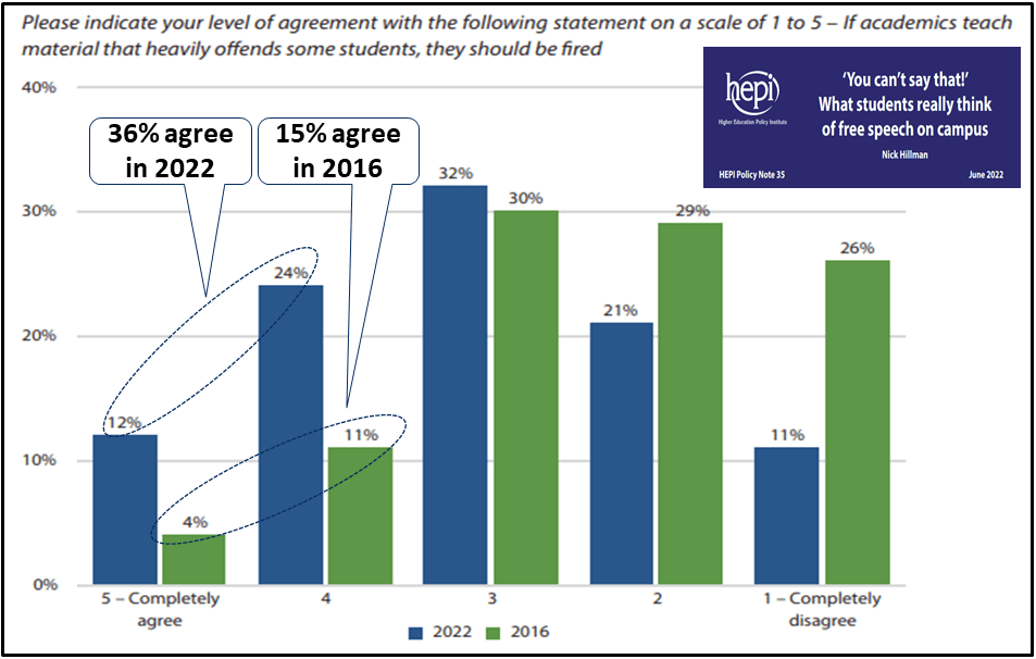 The UK’s Higher Education Policy Institute reporting presents the shift to less liberal views on free expression as not in line with traditional academic norms. (To some of the Australian scholars I have heard from on these questions in 2022, this UK snapshot will recall the Chart 15 scenario outlined in my July discussion paper.)