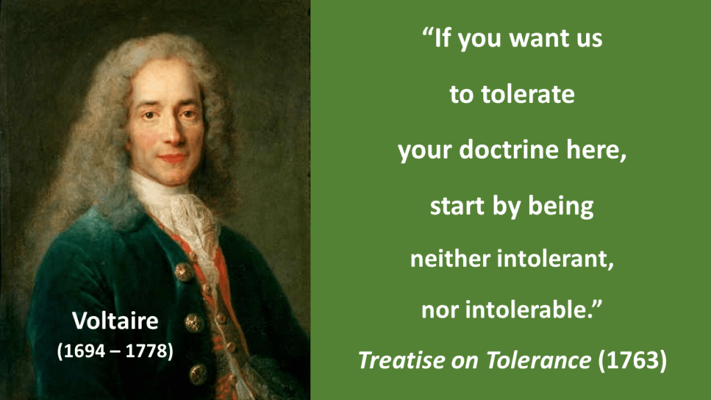 This recalls a hard-won Enlightenment principle, invoked by Voltaire to counter the religious-war atrocities of 18th century Europe: The supposed “right of intolerance” is absurd and barbaric. It is the right of the tiger … indeed worse, for tigers tear just for food, while we rend each other for paragraphs…