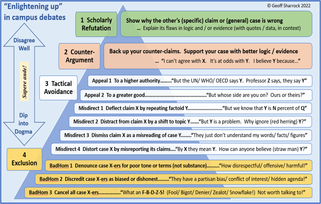 This hard heads/soft hearts model is one way to align practice with the institutional stances noted earlier, by vice-chancellors Duncan Maskell and Dawn Freshwater (see Notes). And perhaps add some spine to the policy mix, to lower the risk of soft headed/hard hearted outcomes, whenever the least tolerant parties rely on meta-argument allegations and call for sanctions against those who won’t subscribe to their doctrine.