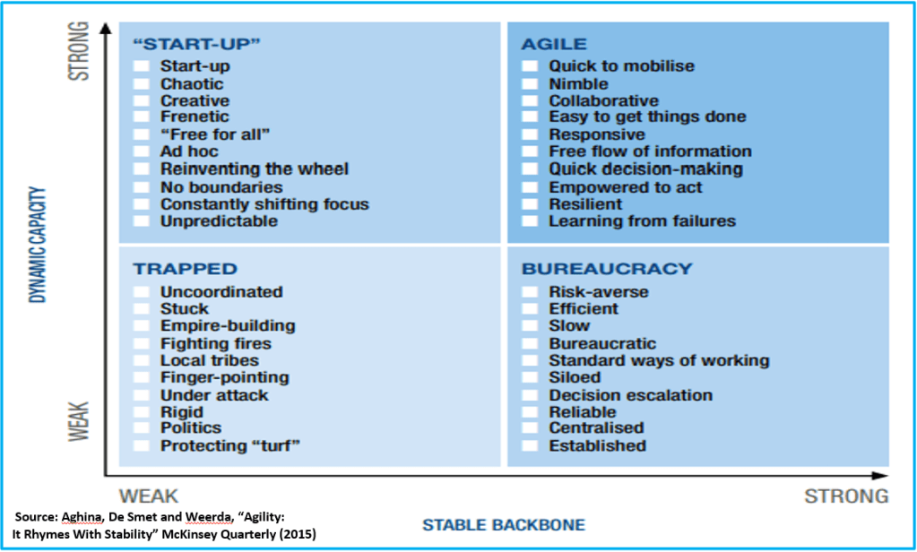 Big business experience offers some lessons for universities here. The 2017 paper drew on some McKinsey reporting on agility in 2015: “In their discussion of organisational agility in large scale business enterprises, Wouter Aghina and his McKinsey colleagues describe three types of decision in any system of governance: