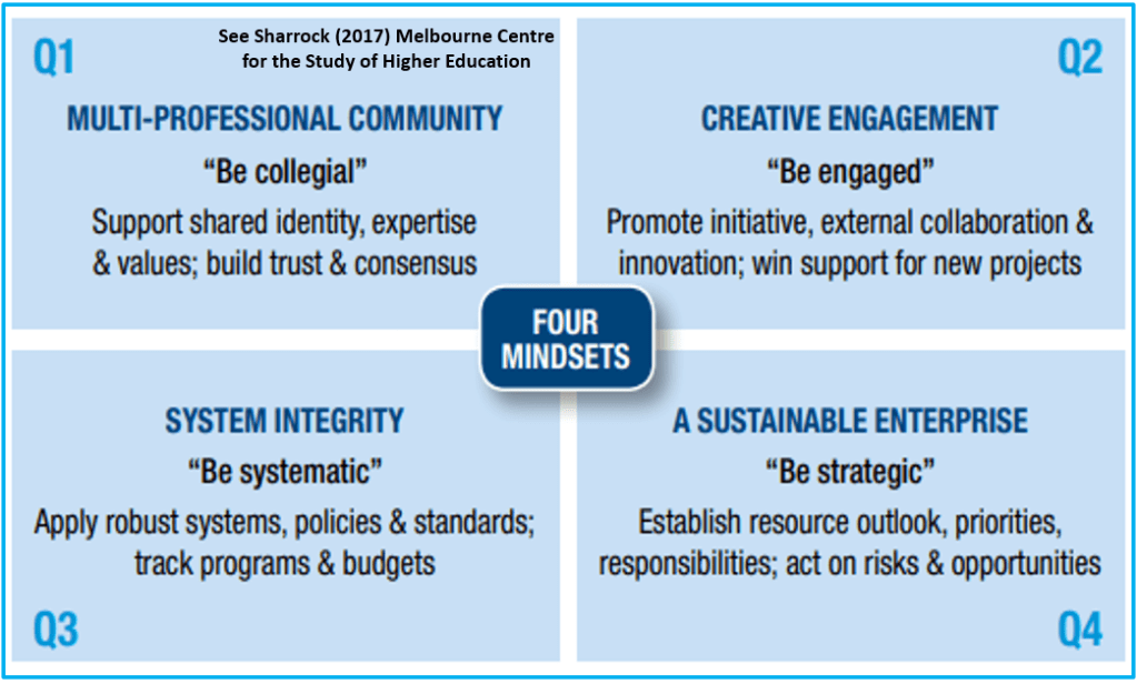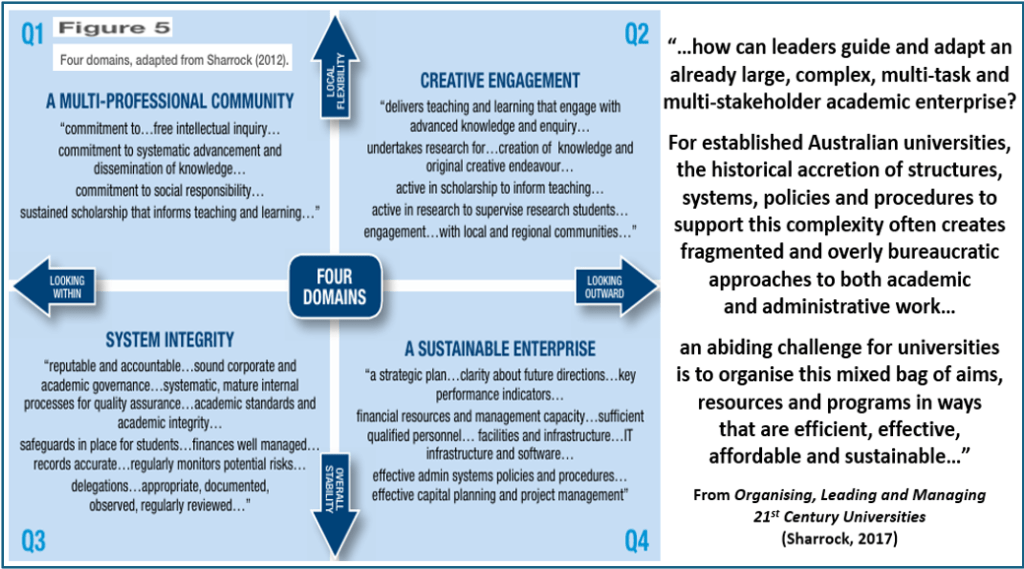 As the 2017 paper put it: “In the Q1 and Q2 domains the main leadership task is to support front line professionals and programs as they work to fulfil institutional purposes, directly or indirectly. Most of this work occurs at a local department or program level where scholars and other professionals pursue or support the enlightenment agendas of higher learning. In the Q3 and Q4 domains, leaders are concerned primarily with the institution’s corporate and administrative functions. Here the focus of their work is on strategy and capacity building in the ‘enterprise’ domain; and governance, quality assurance and reporting in the ‘integrity’ domain. Thus enterprise capability agendas loom large for leaders, to secure resources, optimise processes and manage risk…”