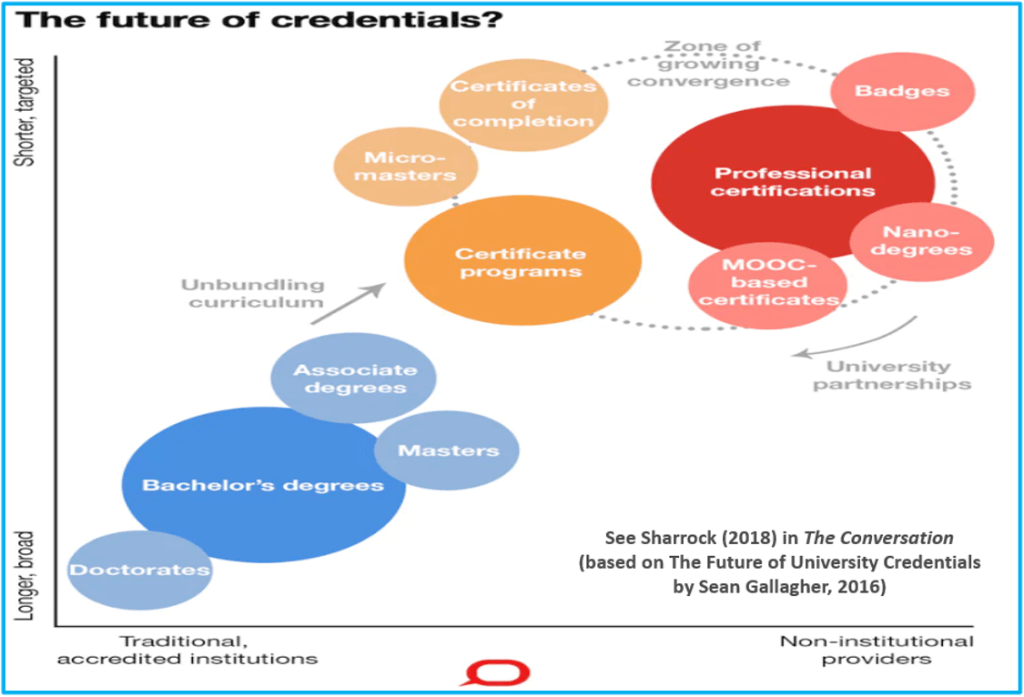 This mixed-mode, multi-market future of post-secondary study presents a host of challenges for universities. Not least the emergence of non-degree credentials that employers recognise and value, and that other kinds of providers are well able to offer at very low cost. In a 2018 commentary on tertiary education reform issues in The Conversation, I set out some implications (see Chart 5):