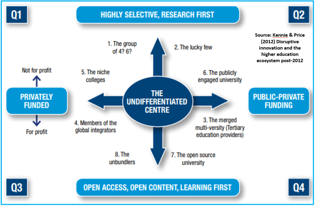 From this and other reports, here’s my take from 2017: “In these future scenarios lower operating costs, greater flexibility and greater external engagement are seen as essential responses by existing institutions. The crucial unknowns here are: the extent of coming changes to models and methods and how rapidly these will unfold; and in turn, what degree of disruption will follow…” And a plausible prospect was the more diversified “ecosystem” predicted in 2012 for UK higher education, by Tom Kennie and Ilfryn Price (Chart 3).